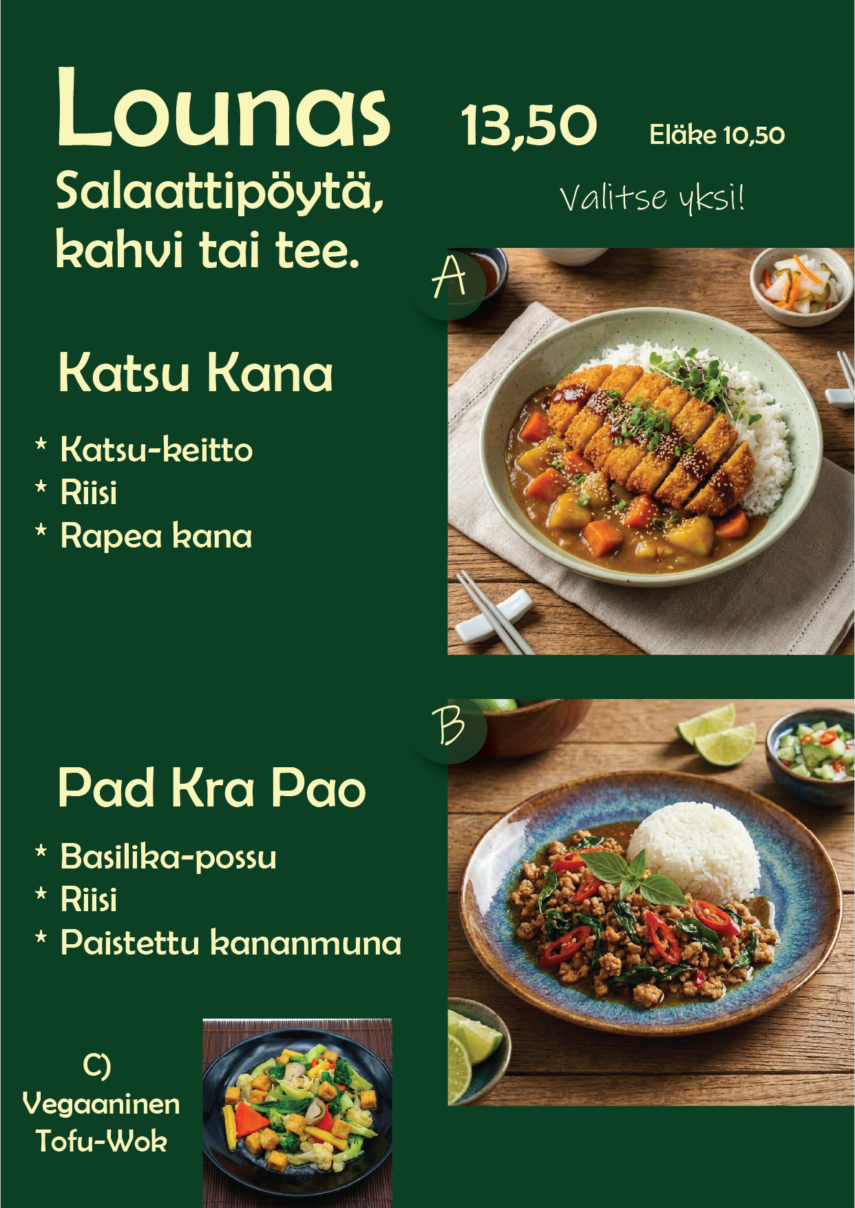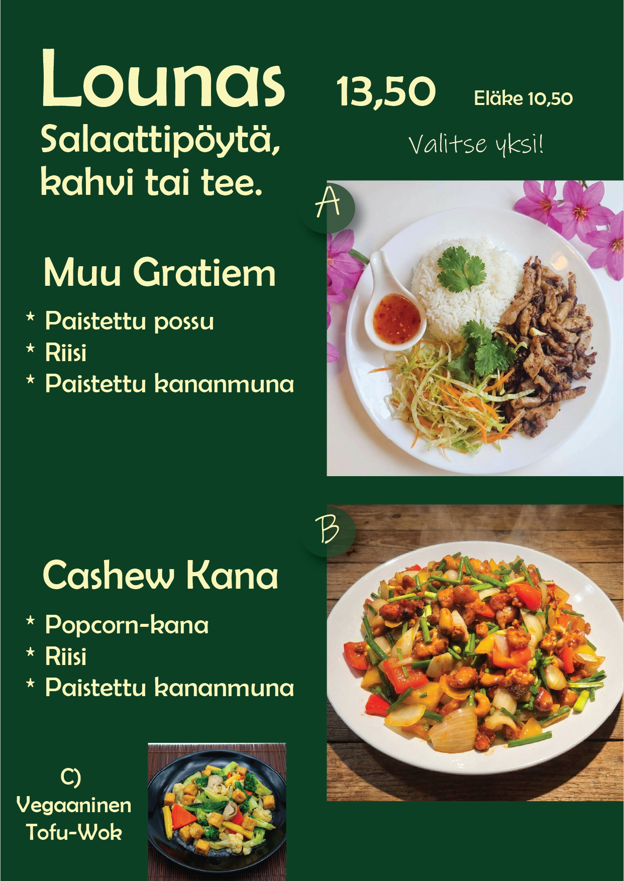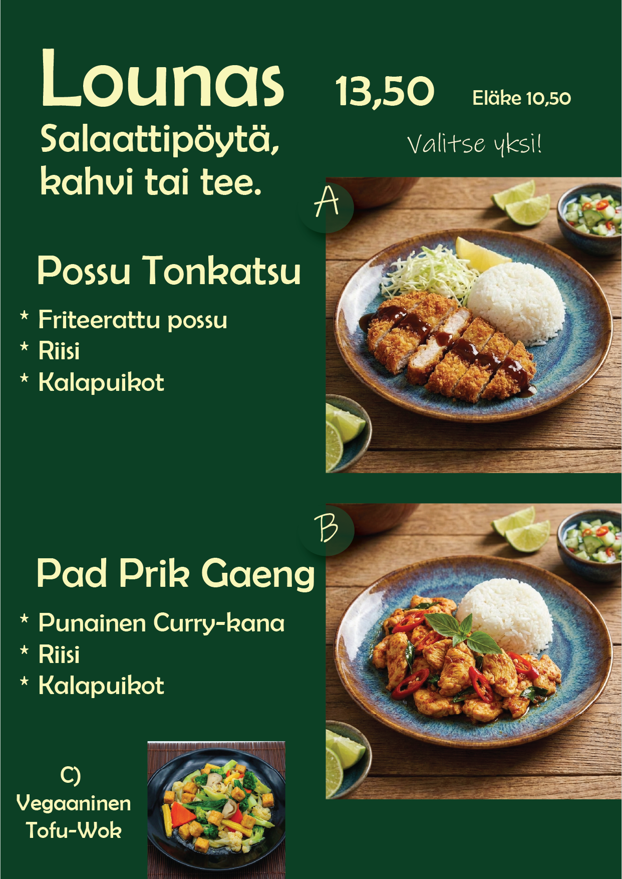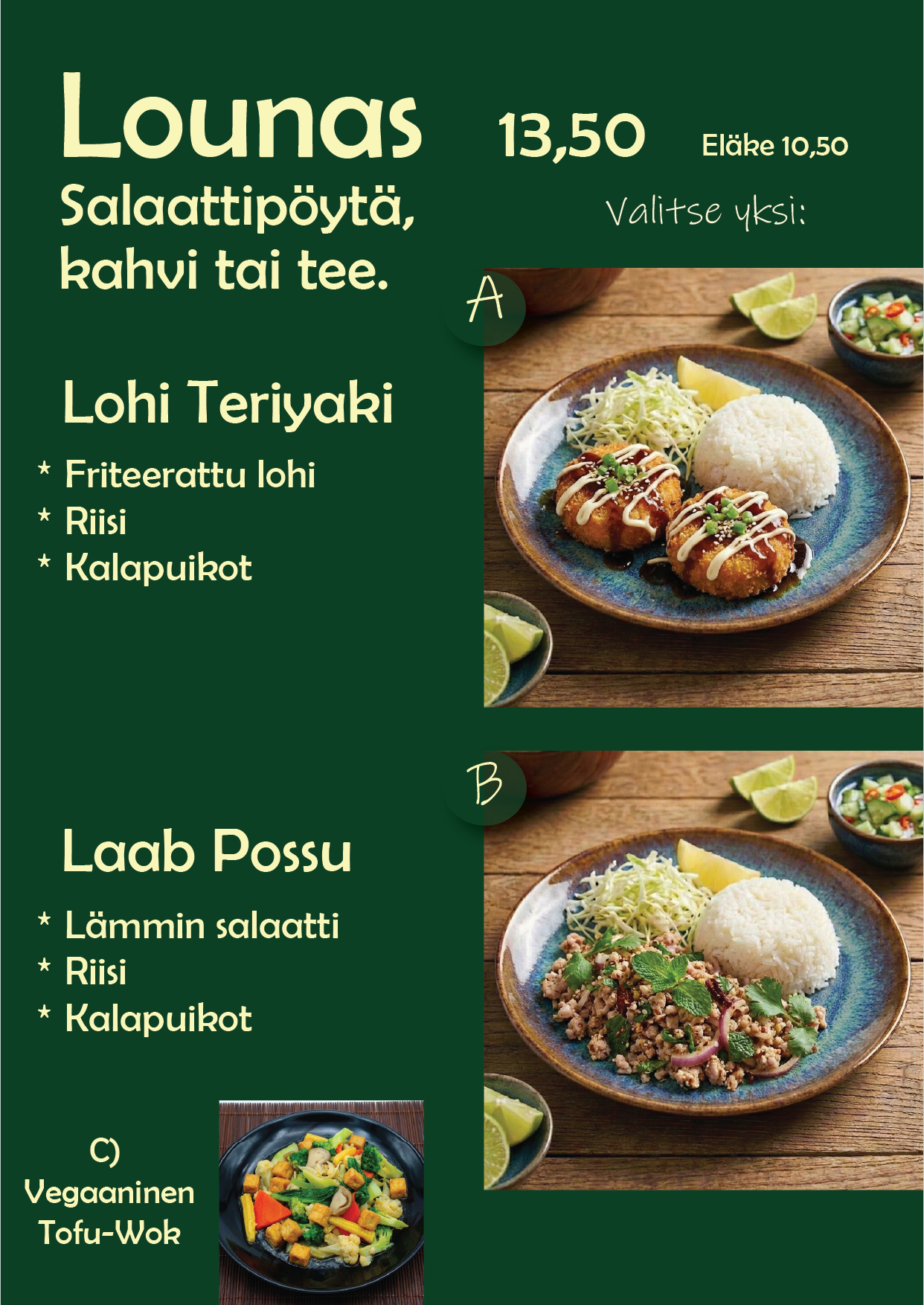 Sisältää runsaan salaattipöydän ja kahvin tai teen.
